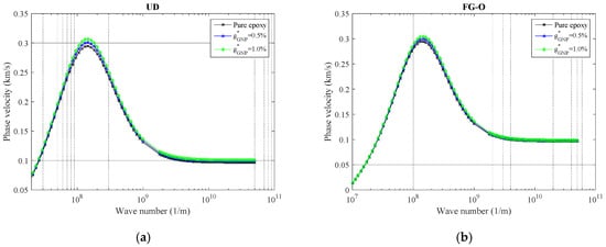 To investigate the impact of the GNPs weight fraction on wave response for the polymeric nanocomposite curved beam reinforced by the GNPs for different wave numbers, Figure 4 is plotted based on phase velocity responses. Pure epoxy indicates the g*GNP = 0, while it increases to 1%. In fact, the higher GNPs weight fraction values create a harder nanocomposite curved beam by raising its stiffness which resulted in higher phase velocities. This phenomenon can be easily observed in peaks and also high wave numbers.
