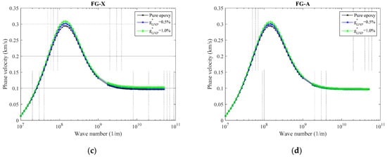 The variation of phase velocity versus weight fraction of GNPs for (a) UD, (b) FG-O, (c) FG-X, and (d) FG-A patterns of GNPs (α = π/4, ℓ = 1 nm, μ = 10 nm, Nl = 10).