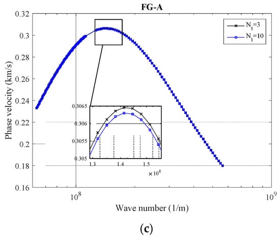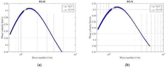 Until now, the total number of involved layers is supposed to be 10. In Figure 5, wave response trends of the nanobeam reinforced by GNP result from different GNP distribution schemes with a variable number of layers plotted. To prepare this model, the total number is driven for 3 and 10 layers of GNPs. For the selected number of layers in this example (i.e., 3 and 10), regardless of the GNP distribution scheme, the reduction in the number of layers can increase somewhat the material capability of reinforced nanocomposite in which an increment in the phase velocity index is a result. However, in order to obtain a more accurate observation, one must be focused on Figure 2b, where the weight fraction index shows in terms of the number of layers. The reason behind that may be related to the internal interactions of nanobeam atoms so that the visibility of this phenomenon is more at peaks, where the maximum results are observed. Furthermore, as seen previously, FG-X provides the lowest phase velocity while the highest ones are resulted from the FG-O model. It is interesting to note that for the FG-A pattern, variation in the number of involved layers seems to have minimal effect on results.