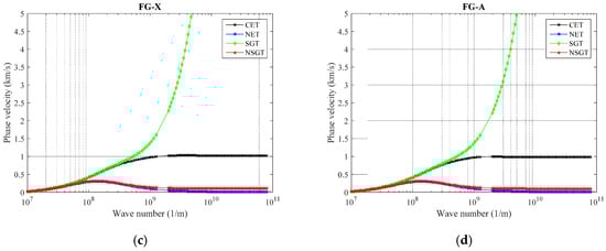 The variation of phase velocity versus different size-dependent theories for (a) UD, (b) FG-O, (c) FG-X, and (d) FG-A patterns of GNPs (α = π/4, ℓ = 1 nm, μ = 10 nm, g* GNP = 1%, Nl = 10).