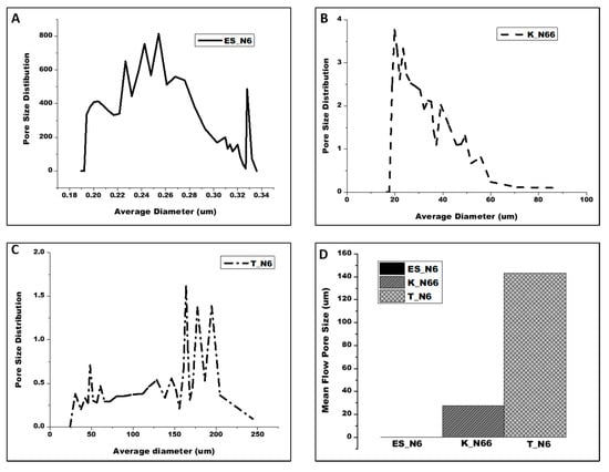 Pore size distribution and mean flow pore size of: (A) nylon 6 nanofibers (ES_N6); (B) nylon 66 knit (K_N66); (C) nylon 6 tricot (T-N6); (D) comparison of the mean flow pore size of ES_N6, K_N66, and T_N6.