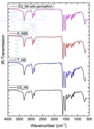 The Fourier transform infrared (FTIR) spectra of permethrin incorporated ES_N6, as-spun ES_N6, as received T_N6, and K_N66, were collected on a FTIR spectrometer (Magna 560, Nicolet Instrument Technologies, Inc., Madison, WI, USA) using the attenuated total reflectance (ATR) mode. The data were recorded in the range of 4000–600 cm−1 with a resolution of 4 cm−1 and a total of 64 scans for each spectrum.