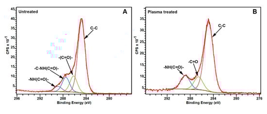 X-ray Photoelectron Spectroscopy was employed to identify the polar groups attached after the plasma treatment. C1s core-level spectra of polyamide-untreated (Figure 4A) and plasma-treated (Figure 4B) samples were deconvoluted with four and three components, respectively. In terms of binding energy, the peak at 284.80 eV is attributed to C in the C–C chain CH2 groups. The peak at 286.10 eV can be associated to the amido-carbonyls [–(C=O)]. The peak at 287.40 eV represents the carbon atoms neighboring the amido nitrogen [–C–NH(C=O)–], and that of 289.03 is assigned to the amide carbonyl carbons [–NH(C=O)–]. An increase in the peak at 289.03 was observed, which can be attributed to a low-level oxidation of the methylene carbons promoted by the plasma treatment [].