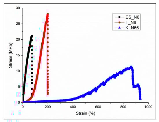Typical stress–strain curves of polyamide fabrics: ES_N6, T_N6, and K_N66.