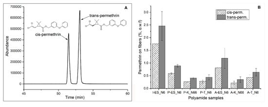 (A): GC chromatogram of cis- and trans-permethrin, and (B): Permethrin (Perm.) content (wt%, o.w.f., trans- and cis-permethrin) on polyamide fabrics after application (I—incorporation during fiber formation, P—plasma-treated, and A—as-spun/received, untreated samples).
