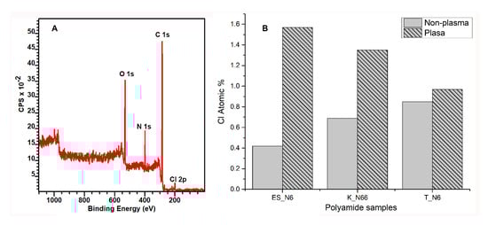 XPS confirmation of the application of permethrin on the polyamide fabrics. (A): Survey scan graph of the polyamide samples with permethrin collected at 55° take off angle (B): Cl atomic percentage comparison of the untreated and plasma-treated polyamide fabrics.