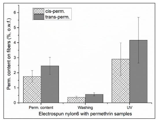 The electrospun nylon 6 with 2.5 wt % permethrin incorporated to the solutions before the formation of the fibers was investigated with regard to fastness of insecticides during washing or to the light. Figure 8 shows the permethrin contents (in wt %, o.w.f., cis- and trans-permethrin) on the I-ES_N6 fabrics after formation, after a washing process and after four hours of direct sunlight exposure. The permethrin content on the nanofibers decreased dramatically (approximately 78% weight loss) after washing; a possible reason for this was because of the insolubility of permethrin in the nylon/formic acid solution, which resulted in poor physical bonding between the permethrin and the fibers. Four-hour direct sunlight exposure did not result in a significant change in the permethrin content on the I-ES_N6. Further study needs to be done by following a standard testing method, such as DIN EN ISO 105-B02.
