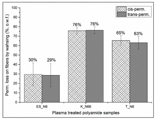 The washing test of the plasma-treated polyamide fabrics (ES_N6, K_N66, and T_N6) is shown in Figure 9. After one washing process, about 30%, 76%, and 63% of the cis- and trans-permethrin are removed from the plasma-treated electrospun, double weft-knit interlock, and warp-knit tricot polyamide fabrics. The plasma-treated electrospun nylon 6 demonstrated the best fastness to washing, due to the significantly small pore size, narrow pore distribution, and high surface area. No significant difference was observed from the two commercially available polyamide fabrics.
