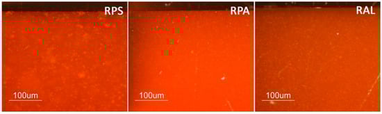 Observation of the transparent samples through optical microscope (OM) showed no significant features, and the surfaces from the three different sheets seemed identical. In turn, some particularities were observed in the red samples. Figure 1 presents OM images of cross-sections of the three red samples. It is visible that RPS sample presents bigger pigment agglomerates than RPA or RAL, which might indicate the use of less finely grounded pigment by Plásticos do Sado. Regarding the RAL sheet, one of the surfaces of the samples presents more accumulation of pigment than the other, Figure 2, which might indicate that polymerization of the PMMA was conducted in horizontal position allowing the pigment to sediment. Although in both industrial methods studied in Portugal the polymerization was mentioned to have been conducted in vertical orientation, the horizontal position was also common [36,37,38] and agrees with the description of the process for Altuglas® production in [4,50].