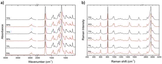 Polymer matrixes were characterized by FTIR-ATR and Raman spectroscopies, Figure 3. PMMA homopolymer is identified in all samples by the strong C=O stretching absorption peak at 1723 cm−1 and the characteristic profiles and relative intensities of the other diagnostic peaks, namely the C–C–O stretching at 1269 and 1239 cm−1, C–O–C stretch at 1190 and 1143 cm−1, and C–H stretching at 2995, 2951, and 2843 cm−1in the FTIR-ATR spectra. In the Raman spectra, the correspondent C–H stretching vibration peaks are visible around 2996, 2949, and 2842 cm−1, as well as the carbonyl stretching at 1727 cm−1. The other dominant bands in the Raman spectra are the C–H bend at 1450 cm−1, the C–O–C stretching at 811 cm−1 and C–C–O stretching at 599 cm−1 [51,52]. No other peaks that could be attributed to additives have been detected. This was expected since additives in PMMA sheet production are normally used in small amounts [53,54] and therefore may be present below the detection limits of these techniques. Alterations in the typical absorptions that could be related with degradation of the polymer in the artist’s samples (TPL and RAL) were also not visible.