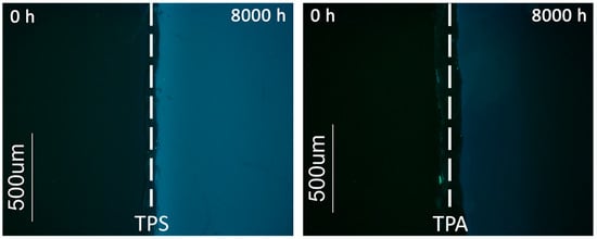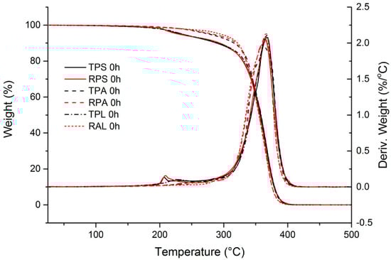 In Figure 12 are presented the TG and DTG curves of the transparent samples after different irradiation times. A common feature in both reference samples (TPS and TPA) is that, with aging, degradation starts at lower temperatures, even though the temperature of maximum decomposition rate remains the same. This shift for lower temperatures reflects the presence of more thermally labile links, which are formed during the photooxidation reactions, in particular as result of chain scission.