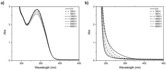 Ultra-violet and Visible spectroscopy was carried out both in transmittance and reflectance modes, given that both transparent and opaque samples were under study. Spectra obtained in transmittance mode were collected using an Agilent Cary 5000 UV-Vis-NIR spectrophotometer (Agilent Technologies, Santa Clara, CA, USA), version 1.12, in a spectral range from 250–800 nm, at a scan rate of 600 nm/min, data interval of 1 nm and acquisition average time of 0.1 s. PMMA samples were placed in a specially designed holder (to ensure analysis was always performed in the same area) and analyzed in 0° angle (perpendicular to the light beam). Spectra obtained in reflectance mode were collected in a Shimadzu UV2501PC spectrophotometer (Kyoto, Japan) equipped with an integrating sphere, in a spectral range from 240–900 nm, at very slow option scan rate, and data interval of 1 nm. BaSO4 was used as reference sample. All spectra were collected as absorption (Abs) spectra.
