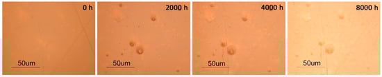 For an easier comparison of the different PMMAs photo-stabilities, the number of scissions per chain was calculated and plotted against irradiation time. A linear fit was performed until 4000 h and the respective parameters are presented in Figure 7. The values obtained are higher than in previous studies [12,30] which may be explained by the different conditions used during the SEC analysis and in the artificial aging, namely the higher temperature inside the aging chamber.
