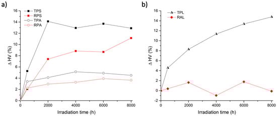 Vickers hardness values variation versus irradiation time for: (a) Reference samples (TPS, RPS, TPA, and RPA); and (b) artist’s samples (TPL and RAL).