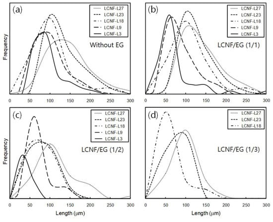 Products that were insufficiently defibrillated because of their less enzymatic hydrolysis or mechanical defibrillation, which are considered to be micrometer scale, could be observed in the low-magnification setting of the optical microscope. Figure 1 shows polarizing optical micrographs of insufficiently defibrillated products obtained from LCNFs with different lignin contents after enzymatic treatment using different EG contents. With decreasing lignin content, the size of fibers was significantly decreased. The dimension and occurrence frequencies of the insufficiently defibrillated products were significantly decreased with increasing EG contents. In particular, the fibers of micron-scale were hardly observed in EG-treated LCNF-L9 and LCNF-L3 at ratios of 1/2 and 1/3 (LCNF/EG), respectively. The effect of lignin and EG contents on the length distribution of the insufficiently defibrillated products is described in Figure 2. In the all samples, the length of the insufficiently defibrillated products was reduced, and their distributions of length became narrower with decreasing lignin content and increasing EG content. This phenomenon was more distinct in the LCNFs with lower lignin contents. The average lengths measured from polarizing optical micrographs are summarized in Table 2. The fiber length was drastically reduced by EG additions. In the case of LCNF-L27, the fiber length decreased from 118.6 to 71.4 mm by addition of EG. Henriksson et al. (2007) [] prepared CNF from bleached wood sulphite pulp via an enzymatic treatment using EG, acid hydrolysis, and high-pressure homogenization. They reported that the fiber length was reduced by addition of EG, and the extent of fine material increased. It was considered that the addition of an enzyme promoted the fiber delamination and thus improved the finer morphology.