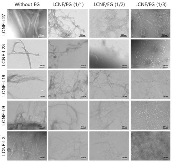 Figure 3 shows TEM images of LCNF without EG treatment and LCNF treated by EG with different contents of lignin and EG. Without EG treatment, LCNF-L27 showed the biggest diameter among the LCNFs. It was observed that the dimensions of LCNF were significantly decreased with decreasing lignin content and increasing EG contents. The effects of lignin and EG contents on the diameter distribution of LCNFs are shown in Figure 4. In all samples, the diameters of the LCNFs decreased and the diameter distributions narrowed significantly with decreasing lignin and increasing EG contents, respectively. In the samples treated with EG at ratios of 1/2 and 1/3 (LCNF/EG), LCNFs showed a diameter of less than 50 nm regardless of lignin content.