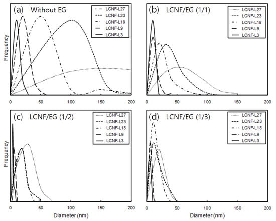 Diameter distribution of LCNFs with different lignin contents after enzymatic treatment using different EG contents; (a) without EG, (b) LCNF/EG (1/1), (c) LCNF/EG (1/2), (d) LCNF/EG (1/3).