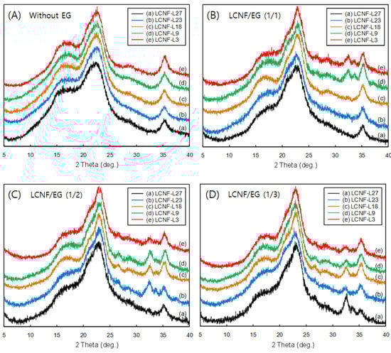 X-ray diffractograms of LCNFs with different lignin contents after enzymatic treatment using different EG contents; (A) without EG, (B) LCNF/EG (1/1), (C) LCNF/EG (1/2), (D) LCNF/EG (1/3).
