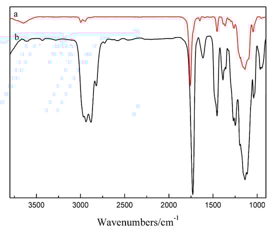 Figure 1a,b shows the FTIR spectrum of the chemical cross-linked gel and the double-crosslinked gel, respectively. It can be seen that the peak of the two gels at 1254 cm−1 is C–O–C stretching vibration, 1469 cm−1 and 2933 cm−1 are the bending and stretching vibration peaks of CH, and the peak at 1133 cm−1 is the vibration absorption peak of –N+(CH2)3–. These characteristic absorption peaks coincide through chemical cross-linking condensation. The characteristic peak of C=O in gel appears at 1760 cm−1 (Figure 1a), while the characteristic peak of C=O in a double-crosslinked gel appears at 1736 cm−1 (Figure 1b). The absorption peak shifted, which indicates that the physical crosslinking of PLLA and PDLA occurred in the double-crosslinked gel. The appearance of these peaks proved that the synthesis of the double-crosslinked hydrogel was successful.