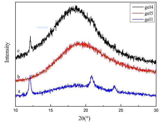 The wide-angle X-ray diffraction profile for (a) physical crosslinked hydrogels, (b) chemical crosslinked hydrogels, and (c) double-crosslinked hydrogels.