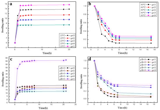 Swelling ratios of hydrogels (a) at 25 °C, pH = 7. (b) at 40 °C pH = 7. (c) at 25 °C, pH = 5, (d) at 25 °C, pH = 9.