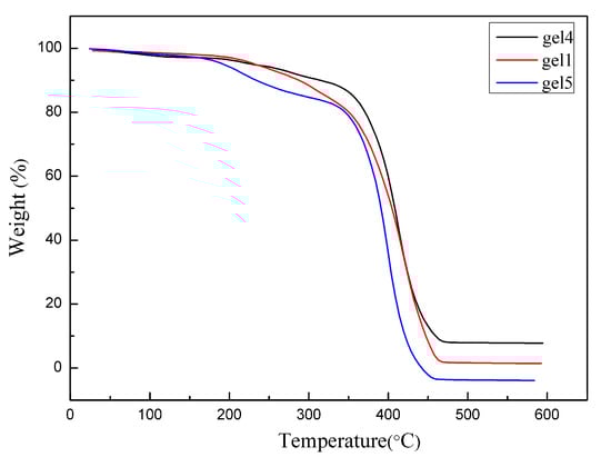 Using a thermal analysis system (TGA) (TGA Q600SDT, TA Instruments, Milford, MA, USA) in a nitrogen atmosphere with a temperature range of 25~600 °C and a heating rate of 10 °C/min to measure the thermal properties of the gel. The thermogravimetric data and the first weight loss temperature should be recorded to compare the thermal stability of the gel.