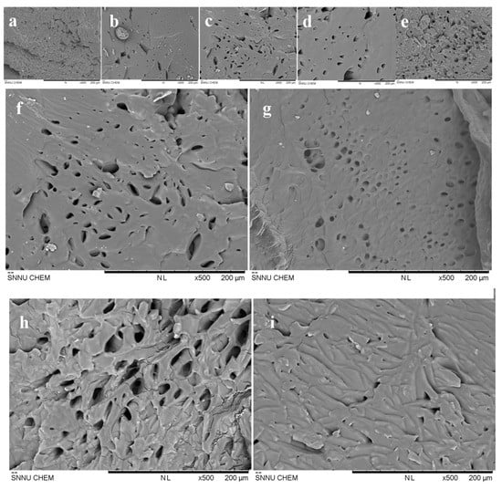 Previous studies on the swelling kinetics and de-swelling kinetics of gels have demonstrated that the synthesized double cross-linked gels have temperature and pH sensitivity. Observing the pore size changes in the network structure of the gel under different conditions through SEM can also verify the temperature and pH sensitivity of the gel. Figure 5 shows scanned photos of freeze-dried gel2 at pH = 7 and 25 °C (Figure 5f), pH = 7 and 40 °C (Figure 5g), pH = 5 and 25 °C (Figure 5h), pH = 9 and 25 °C (Figure 5i). It can be seen from the figure that changes in temperature and pH have a great influence on the network state of the gel. By comparing SEM images in Figure 5f,g, it is found that the temperature has a certain effect on the three-dimensional network structure of the double-crosslinked hydrogels. At pH = 7 and 25 °C, the gel is in a state of swelling with water absorption, and the pore size of the gel structure is large. However, at pH = 7 and 40 °C, the gel is in a state of shrinkage and dehydration, and the pore size is small. The reason is that, at higher temperatures, the hydrogen bond formed by the hydrophilic part P(MEO2MA-co-OEGMA) and water molecules is broken, and the temperature-sensitive polymer chain starts to shrink, which reduces the pore size of the gel and further indicates that the double crosslinked hydrogel is temperature-sensitive. Figure 5h,i shows that pH also has a great influence on the network structure of the hydrogel. At pH = 5 and 25 °C, the gel has a loose network structure and a large pore size. At pH = 9 and 25 °C, the gel has a compact structure and the pore size becomes significantly smaller. The reason is that, at higher pH values (pH > pKa), the DEAEMA unit is deprotonated, the hydrogen bond is formed by the hydrophilic part P(MEO2MA-co-OEGMA), water molecules play a major role, and the polymer chain PDEAEMA shrinks, which results in a tighter network structure of the gel. It further illustrates that the double crosslinked hydrogel has pH sensitivity.