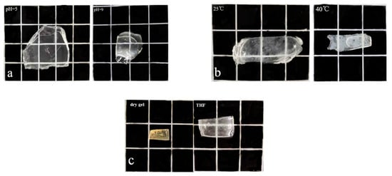 Figure 6 is a digital photo of gel2 in different environments. The side length of each small grid in the picture is one centimeter. Figure 6a shows the swelling photos of gel2 at the temperature of 25 °C and pH values of 5 and 9, respectively. By comparison, it can be seen that gel2 is fully swollen at pH = 5 and shrank at pH = 9, which indicates that the double cross-linked hydrogel has pH sensitivity. Figure 6b is the swelling photo of the gel at pH 7 and temperatures of 25 °C and 40 °C, respectively. It can be seen by comparison that gel2 swells sufficiently at 25 °C and shrinks at 40 °C, which indicates that the double-crosslinked hydrogel has temperature sensitivity. Figure 6c is a comparison diagram of the gel before and after swelling in THF at room temperature. The gel has swelled in THF, which further shows that the synthesized double-crosslinked hydrogel is amphiphilic.