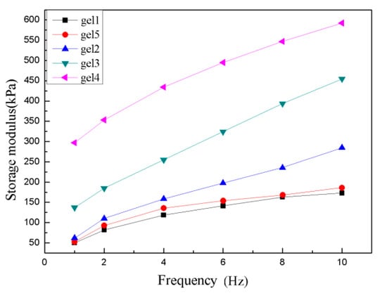 The storage modulus of the hydrogel can reflect its physical and mechanical properties very well. On this basis, we studied the variation curve of the storage modulus of the hydrogel with different cross-linking methods with frequency. Figure 7 shows the changes of the storage modulus of gel1, 2, 3, 4, and 5 with frequency, respectively. It can be seen that, when the frequency is 10 Hz, the storage moduli of the gel are 170 kPa, 283 kPa, 455 kPa, 590 kPa, and 185 kPa, respectively, which indicates that the five hydrogels have good mechanical strength. However, it can be clearly seen from the figure that the storage modulus of the double-crosslinked hydrogel is relatively high and varies with the content of the chemical cross-linking agent. This is because, in terms of the stereo-complex of PLA at the same DP (degree of polymerization), the physical crosslinking point of the gel is the same, and the internal network structure of the gel varies with the content of a chemical crosslinking agent. Gel4 has the highest content of chemical cross-linking agents when forming a gel. The most cross-linking points result in a tight three-dimensional network structure and small pore size. Therefore, the gel has the best mechanical strength. As we all know, the swelling ratio of hydrogels is inversely proportional to the gel strength. Therefore, the comparison results of the gel strength of gel1, 2, 3, 4, and 5 are consistent with their swelling ratio comparison results.