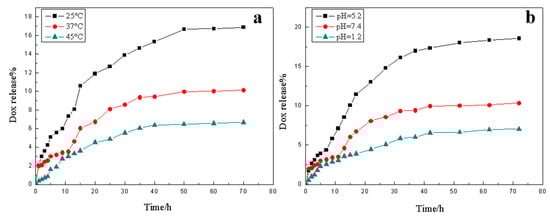 Drug release curve of the dox-loaded hydrogel in phosphate buffered saline solution (PBS) with (a) pH = 7.4 at a different temperature, (b) 25 °C at a different pH.