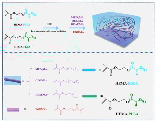 The HEMA-PDLA macromonomer was synthesized by ring-opening polymerization (ROP) with hydroxyethyl methacrylate (HEMA) as the initiator and 1, 8-diazabicyclo [5.4.0] undec-7-ene (DBU) as the catalyst. A specific scheme has been detailed in previous work []. Hydroxyethyl methacrylate (HEMA) (0.121 mL, 1 mmol), D-lactide (1.73 g, 13 mmol), and dry CH2Cl2 (DCM) (50 mL) were added to a dry three-necked flask under dry nitrogen atmosphere. The mixture was stirred until all the monomers were dissolved and then DBU (1, 8-diazabicyclo [5.4.0] undec-7-ene) (20 μL, 0.13 mmol) was injected into the system. After stirring at room temperature overnight, the reaction was terminated after the addition of benzoic acid. The reaction mixture was concentrated and then precipitated twice in n-hexane. The polymers were vacuum dried at 35 °C. The HEMA-PLLA macromonomer is similar to the synthesis of HEMA-PDLA.