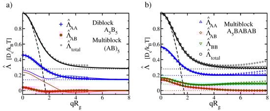 Figure 1a focusses on sequences that are symmetric with respect to exchanging A and B. The thick lines show the mobility function for symmetric diblock copolymers, the thin line the corresponding results for multiblock copolymers with sequence (AB). In the case of diblocks, we have also carried out particle-based simulations of discrete Gaussian chains of length (symbols) for comparison. The data are in good agreement with the theory. The behavior of the dynamic mobilities of diblock and multiblock copolymers is qualitatively quite different: In diblock copolymers, the blocks move largely independent from each other: The mobility component is close to zero in the whole range of q. In contrast, in multiblock copolymers, the motion of blocks is highly cooperative at small q and they start to decouple only at . At , they move independent from each other as expected, i.e., .