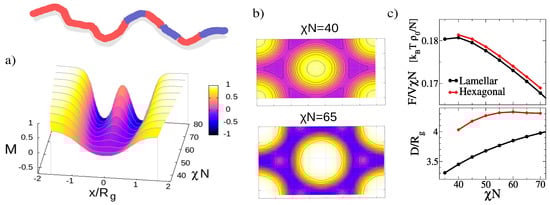 where denotes the local densities at position and time t of monomers of type in vector notation, a mobility matrix, and is derived from the SCF free energy functional via . Hydrodynamics can be included by adding a convective term [] to Equation (1) and combining it with a dynamical equation for fluid flow [,].