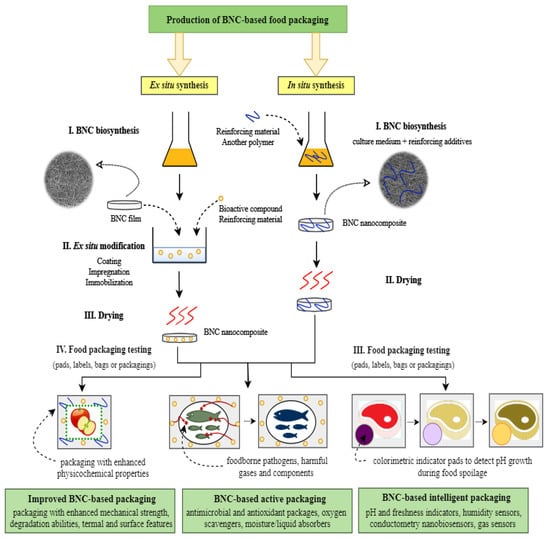Composites based on bacterial nanocellulose belong to a relatively new group of materials, which have been formerly proposed for medical applications but can be successfully used in food packaging industry. The introduction of specific functional groups and thus giving the BNC matrix desired properties is possible due to the chemical and physical modifications of this polysaccharide. In the literature, there are two main approaches to bacterial cellulose functionalization: In situ and ex situ methods [86]. The most common strategy used for biopolymer composite synthesis is in situ technique, which involves the addition of reinforcing materials (e.g., sodium alginate, carboxymethylcellulose (CMC), polyvinyl alcohol (PVA), gelatin, agar, pectin, starch) to the culture medium at the beginning of the BNC production process (Figure 2) [80,87,88,89]. The advantages of this modification are the simplicity and the fact that the added compounds become the part of the growing bacterial nanocellulose fibril network, which allows to obtain stable composites with desirable properties. However, the critical limitations of in situ strategy are additives insolubility in culture media, as well as bacterial growth inhibition activity of some reinforcing compounds [86]. In contrast, ex situ modification is carried out after the BNC production process. This post-synthetic strategy is mainly based on the impregnation of a porous, nanofibrillar BNC matrix with bioactive materials (Figure 2). The main advantages offered by the ex situ technique include the possibility of using antimicrobial agents and preserving the original structural features of bacterial nanocellulose. The main drawback of this modification type is the inability to use hydrophobic reinforcing compounds. In addition, only submicron or nano-sized particles can penetrate into bacterial cellulose pores [89]. Nevertheless, these functionalization methods have led to the improvement of the physicochemical properties of native BNC films, which brings new opportunities for their application on the food packaging market.