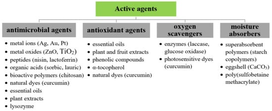 In recent years, the growing customers concerns about the environmental pollution and increasing amount of plastics as well as ecological awareness have led to the progress in new green technologies and innovations in the packaging industry. The future-oriented trends of development in this field include active and intelligent systems of packaging. This new generation of materials plays a key role by protecting food products against external influences, enhancing their quality, safety, and shelf-life, or providing information about harmful changes that may occur during the transport and storage. In contrast to traditional packages, active packaging (AP) interacts with packed food and the surrounding environment by means of active agents incorporated into the packaging films. Therefore, the purpose of these materials is to inhibit or delay the mechanisms responsible for foodstuff degradation and spoilage [56]. On the other hand, intelligent packaging (IP, smart packaging) is designed to specifically monitor the conditions of the packaged food and the surrounding environment. This real-time quality system provides information about various factors provoking changes from initial packaging conditions and lowering food quality during its transport and storage [57].