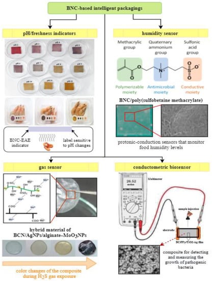 Maintaining a constant level of humidity inside the food packages is an additional critical point that must be fulfilled to prevent foodstuff deterioration. The increased moisture leads to the growth of pathogenic microorganisms, which affects the quality and shelf life of the product [131]. Vilela et al. [119] fabricated a composite through a free radical polymerization of sulfobetaine methacrylate (SBMA) within the BNC nanofibrous network in the presence of poly(ethylene glycol) diacrylate as a cross-linking agent (Figure 4). This intelligent material acted as humidity sensor to control moisture levels in food products during transportation and storage. The BNC/PSBMA composites possessed protogenic moieties (sulfonic acid groups) in their structure, which were responsible for current conductivity upon exposure to humidity. The system enabled the monitoring of changes in ionic conductivity as a function of liquid content [119].