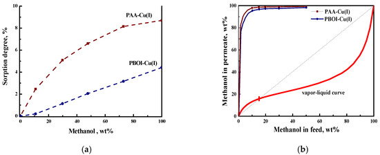 Dependence of (a) equilibrium sorption degree and (b) methanol concentration in permeate on methanol concentration in feed methanol/MTBE mixtures for PAA-Cu(I) and PBOI-Cu(I) membranes, 20 °C [53].