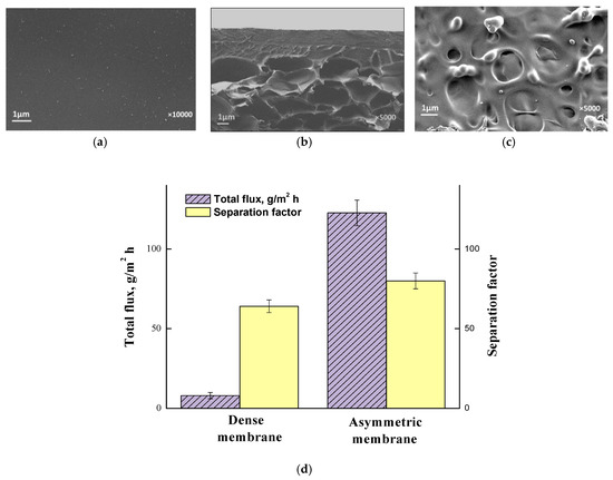 SEM images of asymmetric membrane: (a) top layer, (b) cross-section and (c) bottom. Total flux and the separation factor of asymmetric and dense membranes in the pervaporation of azeotropic methanol/MTBE mixture (14.3:85.7 wt.%) (d) [54].