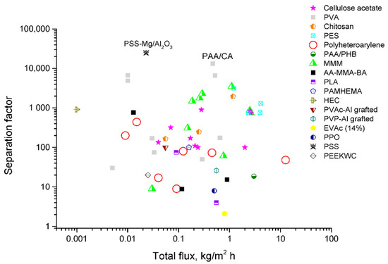 Thus, composite membrane based on polystyrene sulfonate (PSS-Mg/Al2O3) demonstrates the extremely high separation factors, while dual-layer membrane PAA/PHB expectedly shows greater total flux (Table 7).