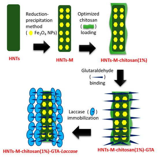 A schematic representation of the stepwise synthesis of HNTs-M-chitosan (1%)-GTA-Laccase is shown in Figure 1. Pristine HNTs were first super-magnetized with the Fe3O4 NPs. This was done by the typical reduction precipitation method. In the reaction mechanism, the Fe3+ ions first attach to the surface of pristine HNTs. Further addition of Na2SO3 partially reduces the attached Fe3+ ions to Fe2+. At the same time, addition of NaOH synthesizes Fe3O4 NPs on the surface of HNTs (HNTs-M). The reduction precipitation is a highly cost-effective, easy, and reliable method compared to the typically-used co-precipitation method [22].