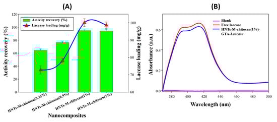 HNTs-M-chitosan (0.25%), HNTs-M-chitosan (0.5%), HNTs-M-chitosan (1%), and HNTs-M-chitosan (2%) were cross-linked with glutaraldehyde (GTA). A total of 100 mg of materials were added to 10 mL of 2.5% GTA solution. The solution was rapidly shaken at 200 rpm for 24 h at 25 °C. The GTA linked materials were separated using a magnet and thoroughly washed with distilled water. The GTA-linked materials HNTs-M-chitosan (0.25%), HNTs-M-chitosan (5%), HNTs-M-chitosan (1%), and HNTs-M-chitosan (2%) were then added to a laccase solution (1 mg/mL) in sodium acetate buffer (100 mM, pH 4). The mixtures were continuously shaken at 200 rpm for 24 h at 20 °C. Afterward, immobilized laccase were separated magnetically and thoroughly washed with the sodium acetate buffer (100 mM, pH 4). The immobilized laccase was immediately tested for activity recovery (%) and laccase loading. The activity recovery (%) was calculated by Equation (1):