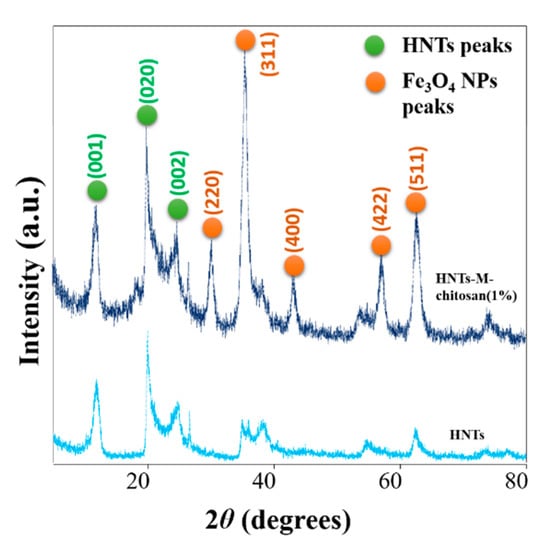 The crystallinity analysis was performed by determining the X-ray powder diffraction (XRD) patterns of pristine HNTs and HNTs-M-chitosan (1%) (Figure 4). The HNTs and HNTs-M-chitosan (1%) showed typical XRD peaks 11.82°, 19.94°, and 24.55°, which mainly corresponds to HNTs crystalline planes of (001), (020) and (002), respectively (JCPDS 29-1487) [27]. The sharp peak at (2θ = 11.82°) in HNTs-M-chitosan (1%) indicates basal space reflections of the nanotubular multiwall structure of HNTs [27]. This suggest the HNTs nanotubular nature was consistent after the surface modifications. However, in HNTs-M-chitosan (1%), additional peaks of Fe3O4 NPs 30.22°, 35.37°, 43.23°, 57.13°, and 62.68°, which corresponds to their respective indices (220), (311), (400), (422), and (511), respectively, was observed (JCPDS 19-0629) [39]. This result confirmed the Fe3O4 NPs modified the HNTs surface. The HNTs and the Fe3O4 NPs diffraction peaks are marked with light green circles and orange circles, respectively (Figure 4). Thus, the chitosan and Fe3O4 NP modifications do not alter the basic crystalline nanotubular structure of HNTs. The XRD results were in strong agreement with the morphological observations made by the SEM and HR-TEM analyses (Figure 3).