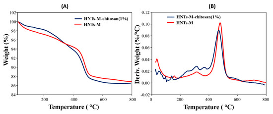 TGA (A) and derivative thermogravimetry (DTG); (B) analysis of HNTs-M and HNTs-M-chitosan (1%).