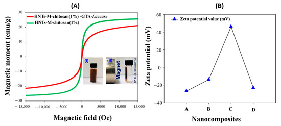 (A) Vibrating sample magnetometer (VSM) analysis of HNTs-M-chitosan (1%) and HNTs-M-chitosan (1%)-GTA-Laccase (i) HNTs-M-chitosan (1%) without magnet and (ii) HNTs-M-chitosan (1%) with magnet; and (B) zeta potential analysis of A- HNTs, B- HNTs-M, C- HNTs-M-chitosan (1%) and D- HNTs-M-chitosan (1%)-GTA-Laccase in the water solution at temperature of 25 °C.