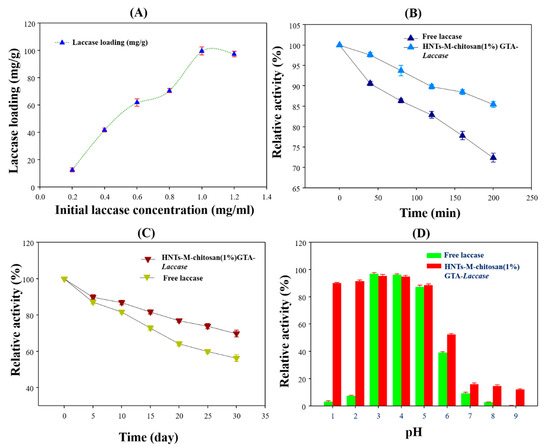 Immobilized enzymes may display enhanced biocatalytic properties [3]. Hence, after immobilization, it is important to assess the biocatalytic properties of the immobilized enzyme. We analyzed the laccase loading pattern by varying initial laccase concentration, the thermal stability performance, the temporal stability, and the pH stability of our immobilized laccase nanocomposites (Figure 7). Figure 7A shows the laccase loading as the initial laccase concentration was increased from 0.2 to 1.2 mg/mL. The laccase loading sharply declined for initial laccase concentrations above 1 mg/mL. At the initial laccase concentration of 1 mg/mL, HNTs-M-chitosan (1%)-GTA exhibited 99.61 mg/g of laccase loading. This may be due to the saturation of sites on the HNTs-M-chitosan (1%)-GTA available for immobilization. A similar effect was observed for the loading of the enzyme naringinase on chitosan microspheres [41]. The thermal stability is shown in Figure 7B. The free laccase lost 28% of its initial activity after incubating at 60 °C for 6 h. However, HNTs-M-chitosan (1%)-GTA-Laccase only lost 15% of the initial activity. The obtained results confirm that the immobilization of laccase on the HNTs-M-chitosan (1%)-GTA nanocomposites significantly enhanced the thermal stability of laccase. The binding of the enzyme to a support provides mechanical support to prevent enzymatic denaturation at higher temperatures [5].