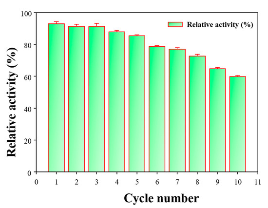 Repeated use of the immobilized laccase is essential for its economic viability [42]. The repeated cycle study of the HNTs-M-chitosan (1%)-GTA-Laccase is shown in Figure 8. A total of 10 repeated cycles were performed. At the end of the 10th cycle, HNTs-M-chitosan (1%)-GTA-Laccase retained 60% of the initial activity. This result suggests exceptional reusability for the immobilized laccase, representing a significant improvement upon recently reported nano-supports for laccase immobilization [29,31,42,43]. Thus, the biocatalytic performance of the HNTs-M-chitosan (1%)-GTA-Laccase is excellent, resulting in a wide array of potential applications.
