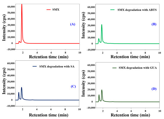 The high-performance liquid chromatography (HPLC) analysis of (A) sulfamethoxazole (SMX), (B) HNTs-M-chitosan (1%)-GTA-Laccase catalyzed SMX degradation with ABTS; (C) HNTs-M-chitosan (1%)-GTA-Laccase catalyzed SMX degradation with syringaldehyde (SA) and (D) HNTs-M-chitosan (1%)-GTA-Laccase catalyzed SMX degradation with guaiacol (GUA).