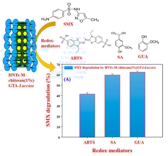 Pollution by pharmaceutical compounds poses serious environmental issues [42]; thus, their removal from water supplies is crucial. We used SMX as an example pharmaceutical compound pollutant. The HNTs-M-chitosan (1%)-GTA-Laccase does not degrade SMX in the absence of the redox mediator, because laccase requires a redox mediator compound to degrade SMX [10]. Immobilized laccase reduces the redox mediator compound, which then catalyzes the degradation of the target pollutant [22]. In this work, we used ABTS, SA, and GUA as redox mediators. The degradation of SMX by HNTs-M-chitosan (1%)-GTA-Laccase in the presence of ABTS, SA, and GUA was analyzed by HPLC (Figure 9A–D). Free SMX shows a clear and sharp peak at a retention time of 1.87 min (Figure 9A). The ABTS, SA, and GUA-mediated SMX degradation products exhibited two sharp peaks at 1.87 min and 1.45 min. However, the intensity of the 1.87 min peak decreased significantly compared to the standard SMX in presence of all the redox mediators. Hence, the split in standard SMX peak at 1.87 min and significant decrease in its intensity confirms the redox mediated breakdown of SMX by HNTs-M-chitosan (1%)-GTA-Laccase. Among all redox mediators, the GUA exhibited the highest decrease in the intensity of the 1.87 min peak of standard SMX. Thus, GUA found to be the best redox mediator than the ABTS and SA. The result is consistent with the previous report [10]. This might be due to the small molecular nature and easy way oxidation by laccase. The oxidized GUA by immobilized laccase immediately gets reduced by causing oxidative degradation of the SMX. This might accelerates the SMX degradation in presence of the GUA. The schematic of immobilized laccase, structures of SMX, ABTS, SA, and GUA and degradation percentage of SMX by redox mediators are shown in Figure 10.