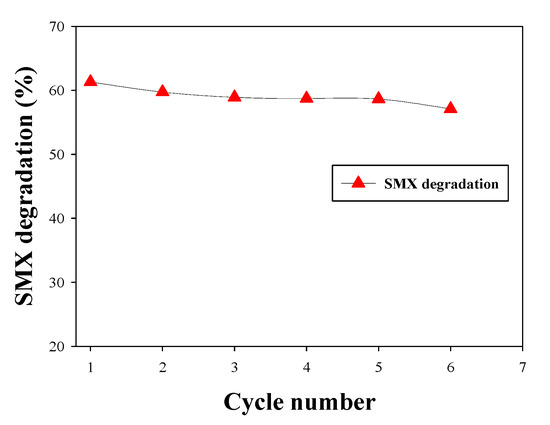 The HNTs-M-chitosan (1%)-GTA-Laccase degraded 41%, 59%, and 62% of the SMX with ABTS, SA, and GUA, respectively (Figure 10). Cost effective and efficient technologies for environmental pollutants removal are highly important [44]. Hence, GUA is known to be green, valuable, economical, and beneficial mediator for laccase-mediated bioremediation applications [45]. Further, we performed six cycles of repeated SMX degradation (Figure 11), suggesting significant potential for the use of HNTs-M-chitosan (1%)-GTA-Laccase in a continuous process. The SMX degradation was observed to be 61.32, 59.73, 58.52, 58.72, and 58.65 in first five cycles of the repeated degradation. The HNTs-M-chitosan (1%)-GTA-Laccase degraded 57.10% of the SMX in the sixth cycle (Figure 11). This designates the strong potential of immobilized laccase. The small decrease of 4% was observed in six cycles. This might be due to the build-up of the degraded product. This result suggests that HNTs-M-chitosan (1%)-GTA-Laccase has significant potential for use in the biocatalytic degradation of pollutants, and can be applied in environmental decontamination processes.