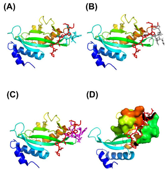 of the binding of UEV domain protein (ribbon model) with the native peptide shown as a stick model (red) and the three cyclic peptides shown as a stick model: (A) CP1 (cyan), (B) CP2 (gray), and (C) CP3 (magentas). (PDB ID: 3obu for the UEV domain protein with the native peptide) (D) The binding motif region of UEV domain protein (residue number: 61–66, 90–100 and 139–145) is shown as surface model, and the native peptide is shown as a stick model (red).